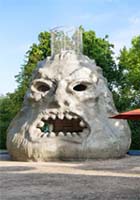 Monster Chetwynd (c’est le nom de l’artiste britannique) a réalisé la première commande destinée au Jardin de l’Art du Kunsthaus Zürich: une tête géante inspirée de Bomarzo, de la science-fiction et de la tradition des folies. L’intérieur abrite une structure à grimper qui invite enfants et adultes à explorer activement la sculpture.