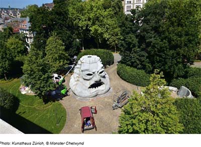 Si quelqu’un a le droit de poser une tête colossale dans le Jardin de l’Art du Kunsthaus Zürich, c’est bien Monster Chetwynd. L’artiste britannique (née en 1973 à Londres, elle vit et travaille à Zurich) est connue pour sa radicalité drolatique, son goût de l’absurde et son humour lourd de sens. Avec ce nouveau travail, elle présente la première commande destinée au Jardin de l’Art du bâtiment Chipperfield: une sculpture dans laquelle il est possible d’entrer, et qui semblera tout droit surgie d’un rêve irréel – ludique, monumentale, ouverte au point d’agacer. Conçue spécifiquement pour ce lieu, cette œuvre accomplira la vocation de ce Jardin de l’Art créé par David Chipperfield.